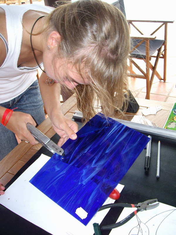 So wurde zuerst das Motiv herausgesucht und dann unter fachmännischer Anleitung von Hans Joachim durch stundenlange Arbeit das Glas geschnitten, gebrochen, geschliffen, mit Kupferfolie eingefasst und verlötet.