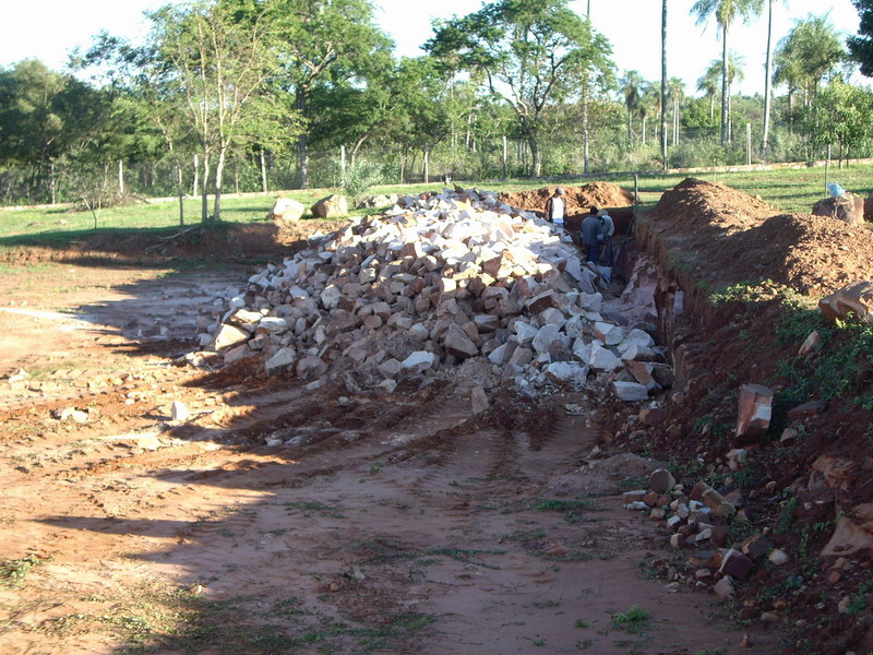 Nachdem vergangenen Sommer mit den Ausgrabungsarbeiten für unseren Sportplatz begonnen wurde, und der Bagger auf massive Felsbrocken gestossen ist, so dass die Arbeiten vorerst eingestellt werden mussten, wurden im Mai die Arbeiten mit Brecheisen und Hammer wieder aufgenommen. 4 Männer hämmerten und brachen 3 Wochen lang Steine aus einer Felsenplatte, so dass der Sportplatz nun eine internationale Tennisfeldgröße aufweisen kann. Nun müssen noch Begradigungsarbeiten vorgenommen und der Platz mit Sand aufgefüllt werden. Übergangsweise werden wir erst einmal einen Beach-Volley- und Soccerplatz bauen.